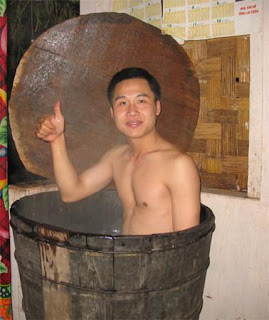 Đi tắm đế vương, khách được mời vào một trong những căn phòng nhỏ, trút bỏ hết mọi xiêm y, ngồi ngâm mình trong một chiếc thùng gỗ, trong đó chứa một loại nước thuốc đen sánh, ngập đến tận cổ, thơm nồng ngai ngái, nóng ran người.