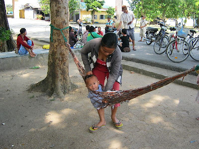 < Chú tiểu be bé và người chị, họ và những người túm tụm ngồi gần đó đang chờ cơm chay...